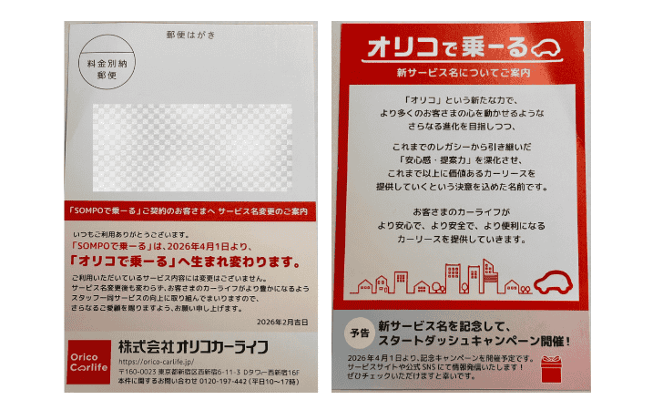 2026年4月1日から「SOMPOで乗ーる」は「オリコで乗ーる」に名称が変わります。